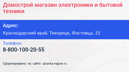 Домострой, магазин электроники и бытовой техники по адресу Краснодарский край, Тихорецк, Фастовца, 21 в дальнейшем Организация, размещена в следующих категориях: