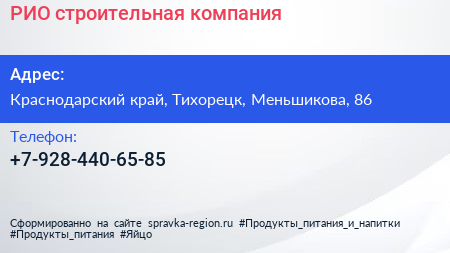 РИО, строительная компания по адресу Краснодарский край, Тихорецк, Меньшикова, 86 в дальнейшем Организация, размещена в следующих категориях: