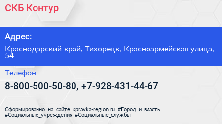 СКБ Контур по адресу Краснодарский край, Тихорецк, Красноармейская улица, 54 в дальнейшем Организация, размещена в следующих категориях: