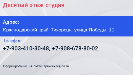 Десятый этаж, студия по адресу Краснодарский край, Тихорецк, улица Победы, 1Б в дальнейшем Организация, размещена в следующих категориях:
