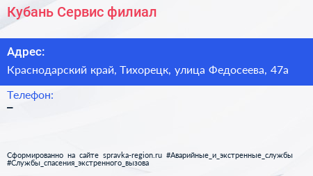 Кубань-Сервис, филиал по адресу Краснодарский край, Тихорецк, улица Федосеева, 47а в дальнейшем Организация, размещена в следующих категориях: