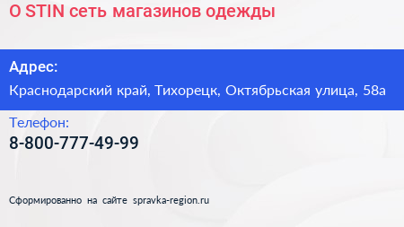 O`STIN, сеть магазинов одежды по адресу Краснодарский край, Тихорецк, Октябрьская улица, 58а в дальнейшем Организация, размещена в следующих категориях: