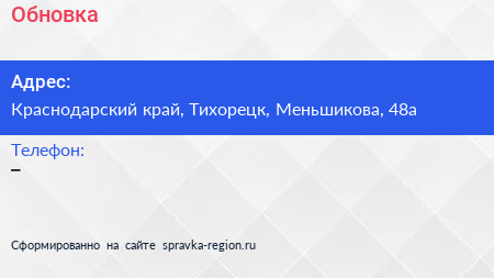 Обновка по адресу Краснодарский край, Тихорецк, Меньшикова, 48а в дальнейшем Организация, размещена в следующих категориях: