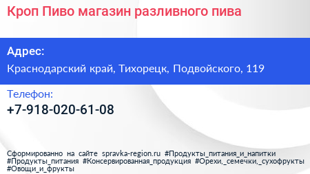 Кроп-Пиво, магазин разливного пива по адресу Краснодарский край, Тихорецк, Подвойского, 119 в дальнейшем Организация, размещена в следующих категориях: