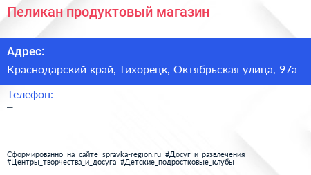 Пеликан, продуктовый магазин по адресу Краснодарский край, Тихорецк, Октябрьская улица, 97а в дальнейшем Организация, размещена в следующих категориях: