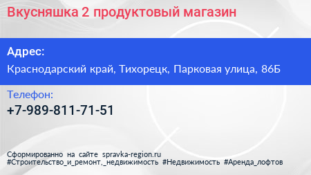 Вкусняшка-2, продуктовый магазин по адресу Краснодарский край, Тихорецк, Парковая улица, 86Б в дальнейшем Организация, размещена в следующих категориях: