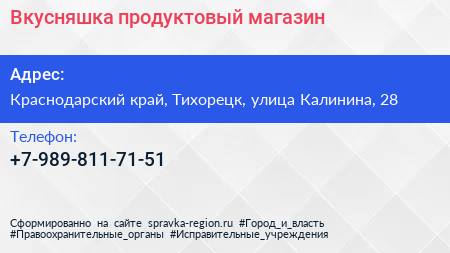 Вкусняшка, продуктовый магазин по адресу Краснодарский край, Тихорецк, улица Калинина, 28 в дальнейшем Организация, размещена в следующих категориях: