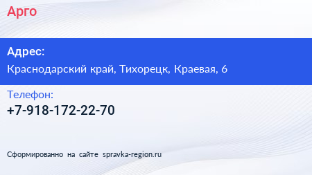 Арго по адресу Краснодарский край, Тихорецк, Краевая, 6 в дальнейшем Организация, размещена в следующих категориях: