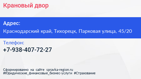 Крановый двор по адресу Краснодарский край, Тихорецк, Парковая улица, 45/20 в дальнейшем Организация, размещена в следующих категориях: