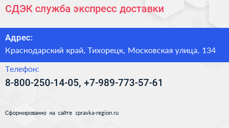 СДЭК, служба экспресс-доставки по адресу Краснодарский край, Тихорецк, Московская улица, 134 в дальнейшем Организация, размещена в следующих категориях:
