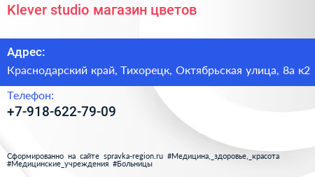 Klever studio, магазин цветов по адресу Краснодарский край, Тихорецк, Октябрьская улица, 8а к2 в дальнейшем Организация, размещена в следующих категориях:
