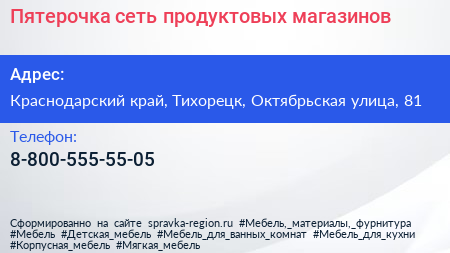 Пятерочка, сеть продуктовых магазинов по адресу Краснодарский край, Тихорецк, Октябрьская улица, 81 в дальнейшем Организация, размещена в следующих категориях: