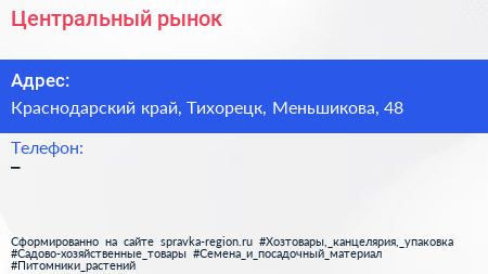 Центральный рынок по адресу Краснодарский край, Тихорецк, Меньшикова, 48 в дальнейшем Организация, размещена в следующих категориях: