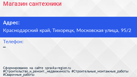 Магазин сантехники по адресу Краснодарский край, Тихорецк, Московская улица, 95/2 в дальнейшем Организация, размещена в следующих категориях: