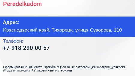 Peredelkadom по адресу Краснодарский край, Тихорецк, улица Суворова, 110 в дальнейшем Организация, размещена в следующих категориях: