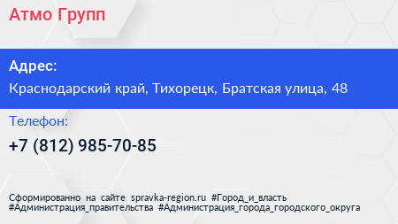 Атмо Групп по адресу Краснодарский край, Тихорецк, Братская улица, 48 в дальнейшем Организация, размещена в следующих категориях: