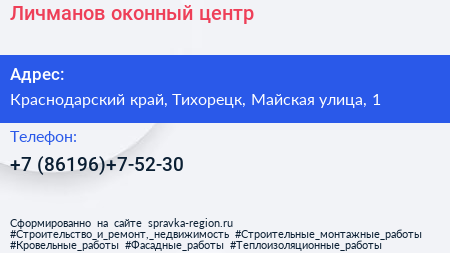 Личманов, оконный центр по адресу Краснодарский край, Тихорецк, Майская улица, 1 в дальнейшем Организация, размещена в следующих категориях: