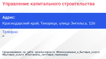 Управление капитального строительства по адресу Краснодарский край, Тихорецк, улица Энгельса, 126 в дальнейшем Организация, размещена в следующих категориях: