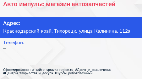 Авто-импульс, магазин автозапчастей по адресу Краснодарский край, Тихорецк, улица Калинина, 112а в дальнейшем Организация, размещена в следующих категориях: