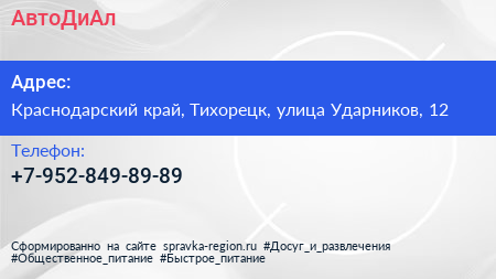 АвтоДиАл по адресу Краснодарский край, Тихорецк, улица Ударников, 12 в дальнейшем Организация, размещена в следующих категориях: