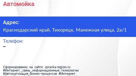 Автомойка по адресу Краснодарский край, Тихорецк, Манежная улица, 2а/1 в дальнейшем Организация, размещена в следующих категориях: