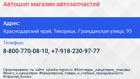 Автошоп, магазин автозапчастей по адресу Краснодарский край, Тихорецк, Гражданская улица, 95 в дальнейшем Организация, размещена в следующих категориях: