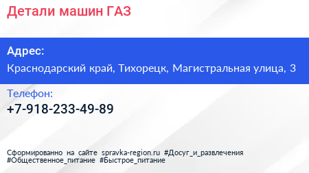 Детали машин ГАЗ по адресу Краснодарский край, Тихорецк, Магистральная улица, 3 в дальнейшем Организация, размещена в следующих категориях: