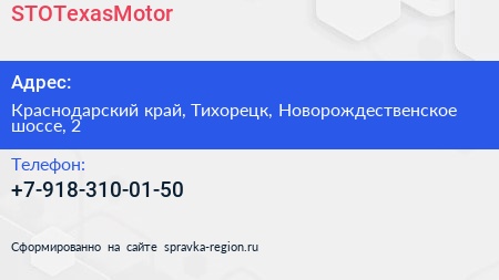 STOTexasMotor по адресу Краснодарский край, Тихорецк, Новорождественское шоссе, 2 в дальнейшем Организация, размещена в следующих категориях: