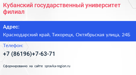Кубанский государственный университет, филиал по адресу Краснодарский край, Тихорецк, Октябрьская улица, 24Б в дальнейшем Организация, размещена в следующих категориях: