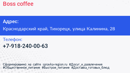 Boss coffee по адресу Краснодарский край, Тихорецк, улица Калинина, 28 в дальнейшем Организация, размещена в следующих категориях: