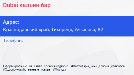 Dubai, кальян-бар по адресу Краснодарский край, Тихорецк, Ачкасова, 82 в дальнейшем Организация, размещена в следующих категориях: