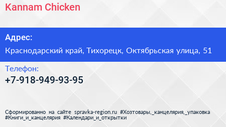 Kannam Chicken по адресу Краснодарский край, Тихорецк, Октябрьская улица, 51 в дальнейшем Организация, размещена в следующих категориях: