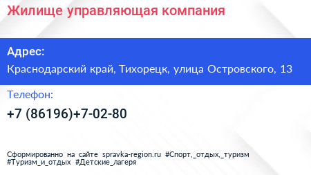Жилище, управляющая компания по адресу Краснодарский край, Тихорецк, улица Островского, 13 в дальнейшем Организация, размещена в следующих категориях: