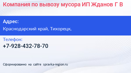 Компания по вывозу мусора, ИП Жданов Г.В. по адресу Краснодарский край, Тихорецк, в дальнейшем Организация, размещена в следующих категориях: