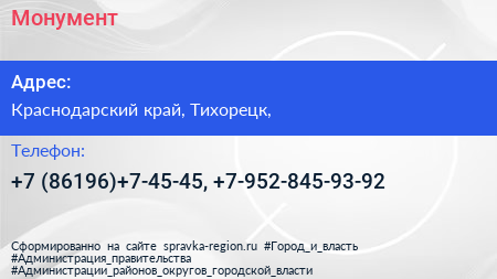 Монумент по адресу Краснодарский край, Тихорецк, в дальнейшем Организация, размещена в следующих категориях: