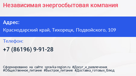 Независимая энергосбытовая компания по адресу Краснодарский край, Тихорецк, Подвойского, 109 в дальнейшем Организация, размещена в следующих категориях: