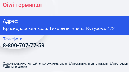 Qiwi, терминал по адресу Краснодарский край, Тихорецк, улица Кутузова, 1/2 в дальнейшем Организация, размещена в следующих категориях: