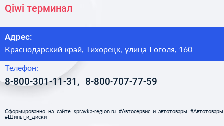 Qiwi, терминал по адресу Краснодарский край, Тихорецк, улица Гоголя, 160 в дальнейшем Организация, размещена в следующих категориях: