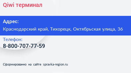 Qiwi, терминал по адресу Краснодарский край, Тихорецк, Октябрьская улица, 36 в дальнейшем Организация, размещена в следующих категориях: