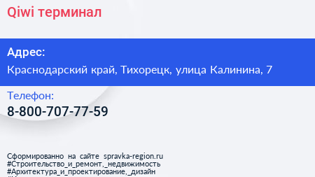 Qiwi, терминал по адресу Краснодарский край, Тихорецк, улица Калинина, 7 в дальнейшем Организация, размещена в следующих категориях: