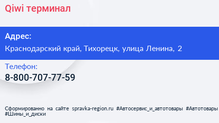 Qiwi, терминал по адресу Краснодарский край, Тихорецк, улица Ленина, 2 в дальнейшем Организация, размещена в следующих категориях: