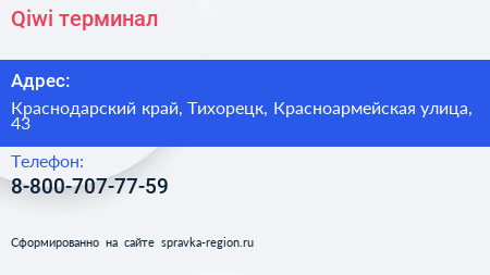 Qiwi, терминал по адресу Краснодарский край, Тихорецк, Красноармейская улица, 43 в дальнейшем Организация, размещена в следующих категориях: