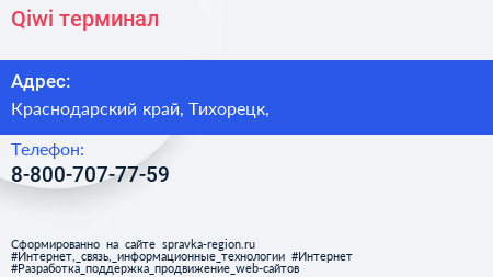 Qiwi, терминал по адресу Краснодарский край, Тихорецк, в дальнейшем Организация, размещена в следующих категориях: