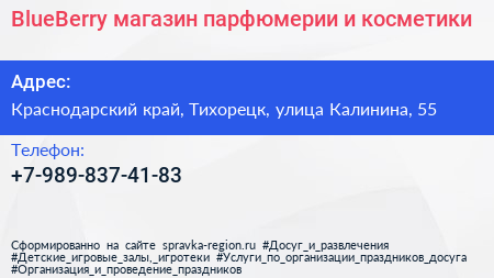 BlueBerry, магазин парфюмерии и косметики по адресу Краснодарский край, Тихорецк, улица Калинина, 55 в дальнейшем Организация, размещена в следующих категориях: