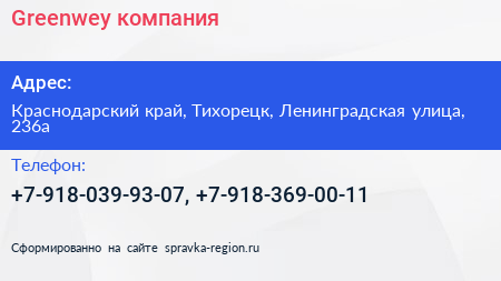 Greenwey, компания по адресу Краснодарский край, Тихорецк, Ленинградская улица, 236а в дальнейшем Организация, размещена в следующих категориях: