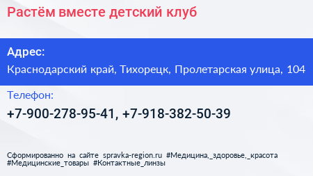 Растём вместе, детский клуб по адресу Краснодарский край, Тихорецк, Пролетарская улица, 104 в дальнейшем Организация, размещена в следующих категориях: