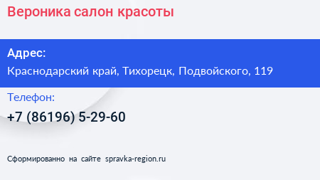 Вероника, салон красоты по адресу Краснодарский край, Тихорецк, Подвойского, 119 в дальнейшем Организация, размещена в следующих категориях: