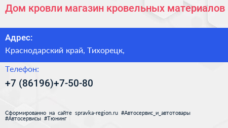 Дом кровли, магазин кровельных материалов по адресу Краснодарский край, Тихорецк, в дальнейшем Организация, размещена в следующих категориях: