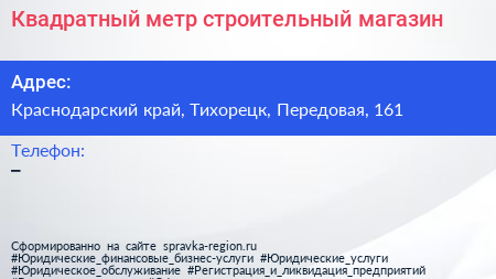 Квадратный метр, строительный магазин по адресу Краснодарский край, Тихорецк, Передовая, 161 в дальнейшем Организация, размещена в следующих категориях: