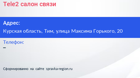 Tele2, салон связи по адресу Курская область, Тим, улица Максима Горького, 20 в дальнейшем Организация, размещена в следующих категориях: